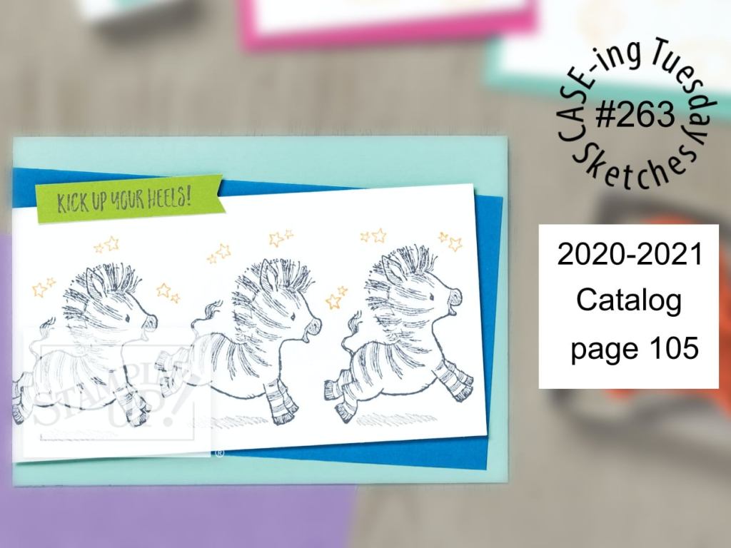 I like to participate in various challenges. The Tuesday Case is one that I like. Each week at 6:00 am, the challenge is posted. The moderator of the group chooses a card sample from the Catalog. This week, #263 comes from page 105 of the Annual 2020 / 2021 Stampin’ Up! Catalog.