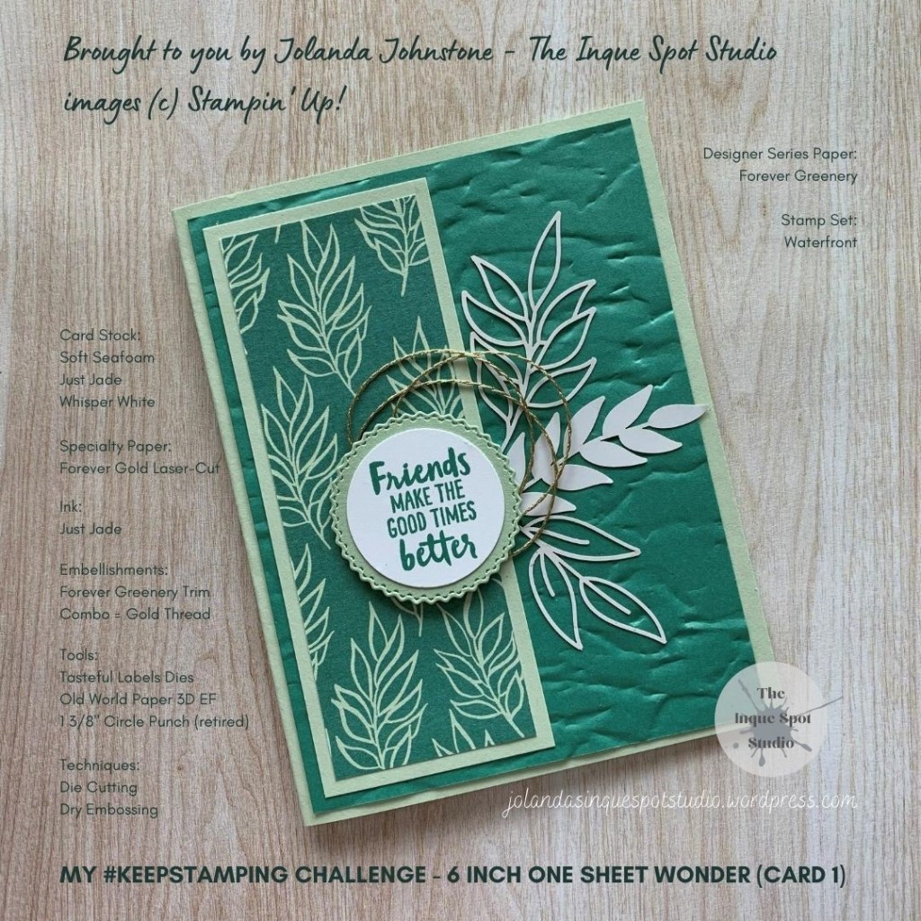 The Soft Seafoam card base is 5 ½” x 8 ½” folded in half for a 4 ¼” x 5 ½” card front. The Just Jade panel is 4” x 5 ¼” and dry embossed with the “Old World Paper 3D” folder.