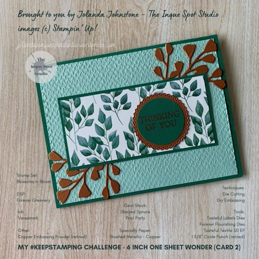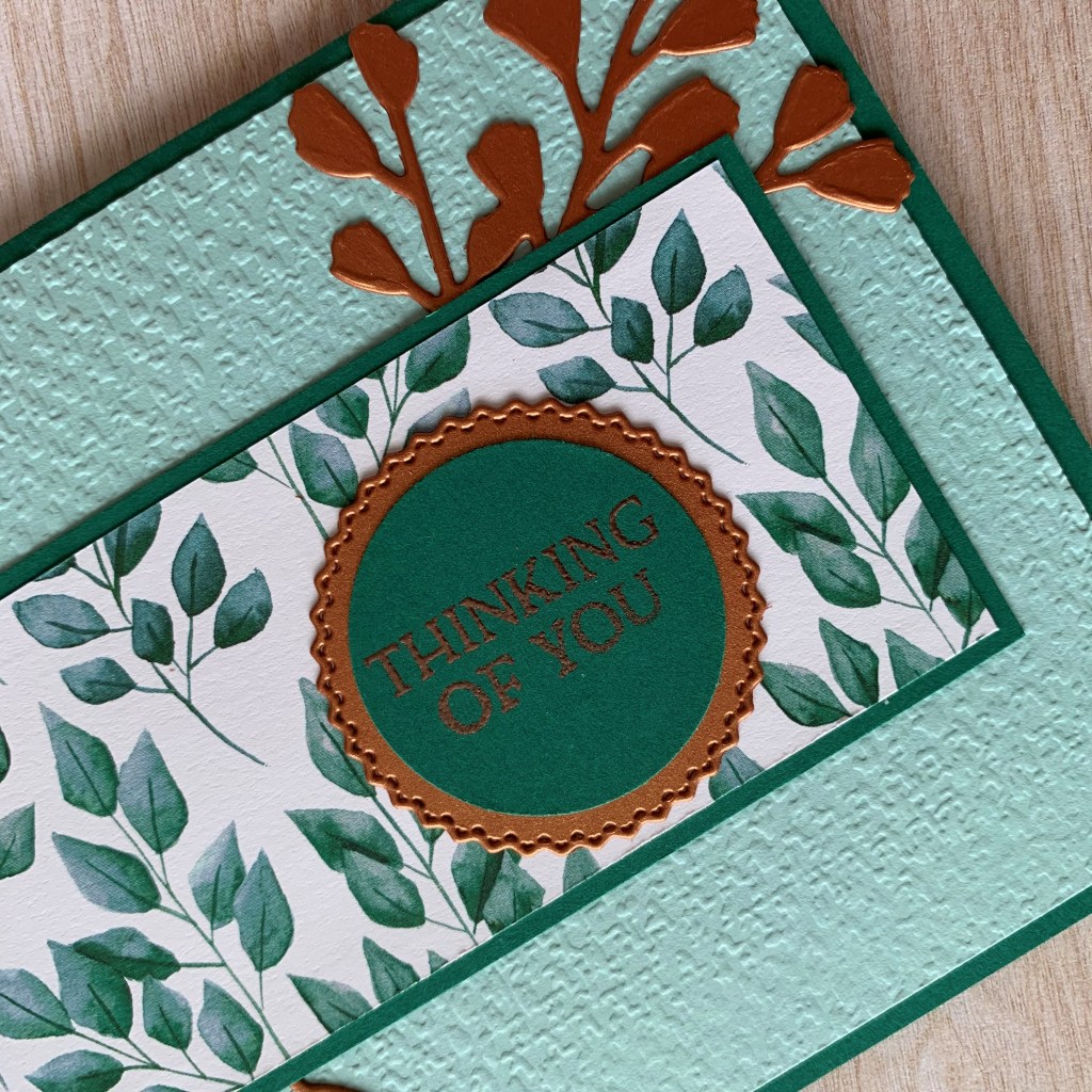 For interest and bling, I added Copper “Brushed Metallic” cardstock elements die cut using both the “Forever Flourishing” and “Tasteful Labels” dies. I opted to copper emboss the sentiment, “Thinking of You” from the “Blossoms in Bloom” stamp set.