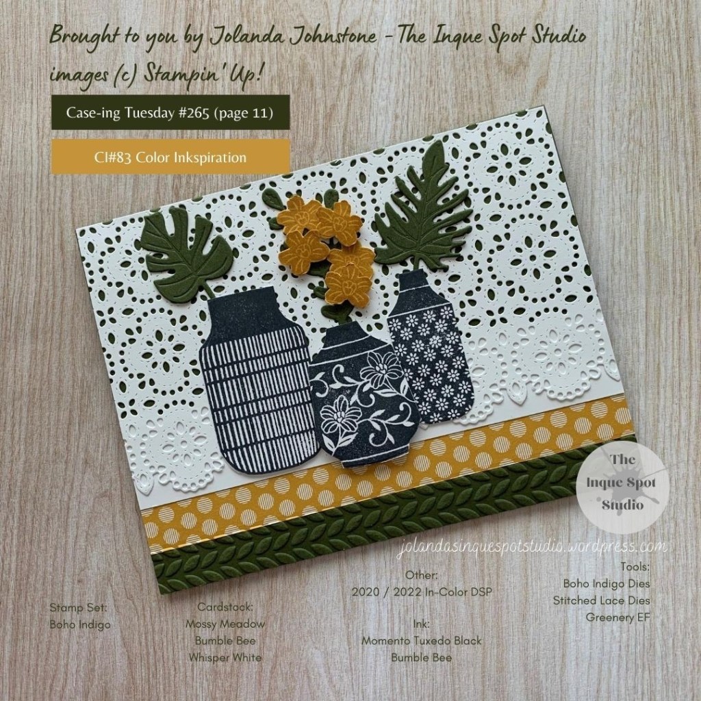 Today, I wanted to feature the Boho Indigo Medley stamp set and dies while incorporating the Color Inkspiration Challenge CI#83 colors of Bumble Bee, Mossy Meadow, Whisper White and Basic Black.