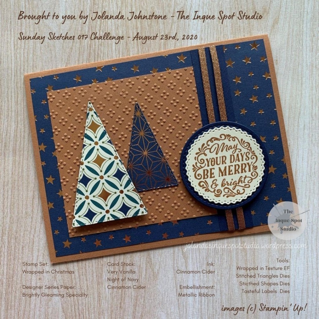 #stampinup, #jolandajohnstone, #theinquespotstudio, #rubberstamps, #handmadecards, #stitchedtrianglesdies, #stitchedshapesdies, #sundaysketches, #makeacardsendacard, #holidaycards, #christmascards, #wrappedinchristmas, #SS017, #sundaysketches