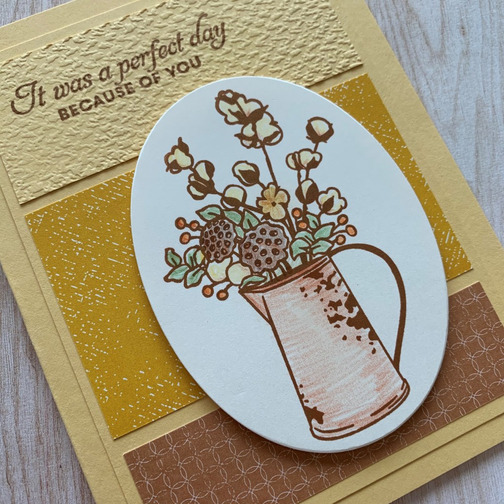 The Watering Can stamped image was chosen for this card because the overall image fit onto / into the cut Oval. I really like the Milk Can but the overall image was too tall.