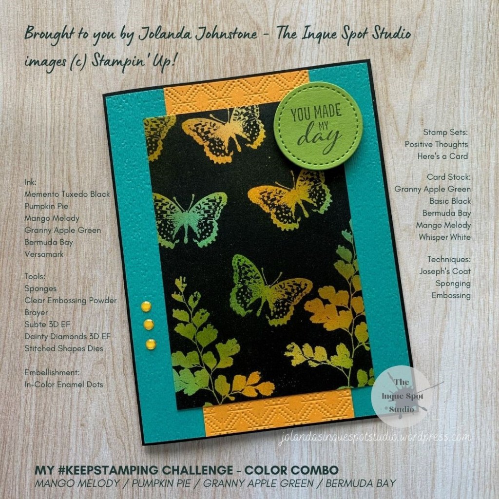 The leafy spray and butterfly images from “Positive Thoughts” are “coated” in Memento Tuxedo Black ink. Using Bermuda Bay and Mango Melody cardstock against the black really makes these images pop.