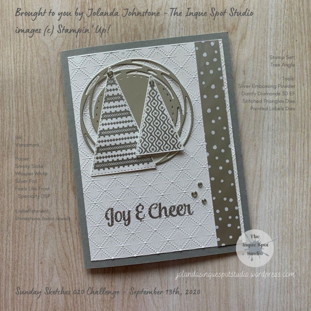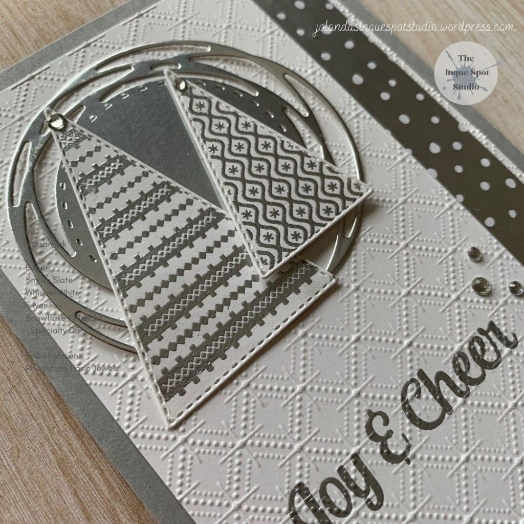stampinup, #jolandajohnstone, #theinquespotstudio, #rubberstamps, #handmadecards, #stitchedtraiangledies, #treeangle, #sundaysketches, #makeacardsendacard, #holidiaycards, #christmascards #SS020, #silverfoil, #snowflakesplendordsp