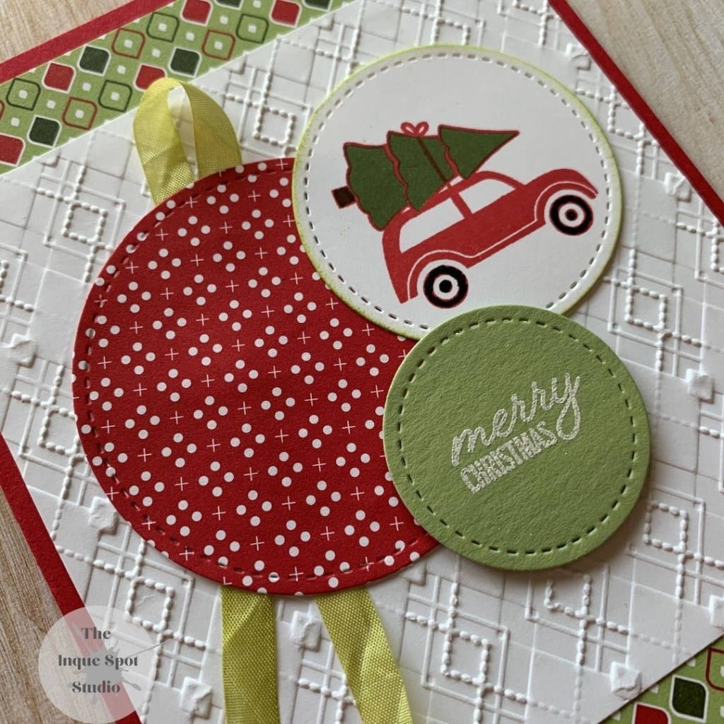 All of the circles are different sizes from the Stitched Shapes Dies. The Real Red pop of another pattern from the same DSP package and a smaller Pear Pizzazz one with the sentiment embossed in White compliment the stamped image.