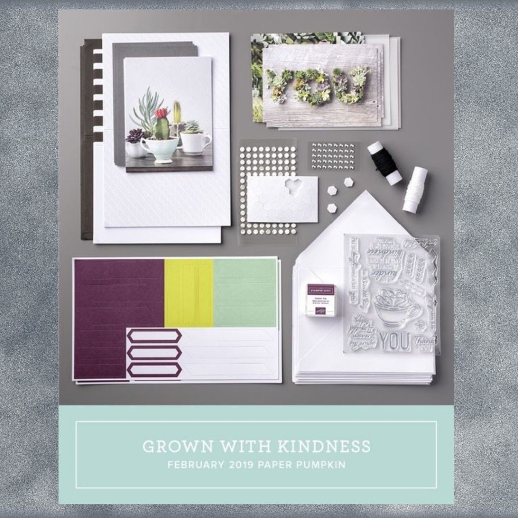 Out of the cupboard and out of the box came the FEBRUARY 2019 – GROWN WITH KINDNESS kit. This kit featured Succulents in photo realistic images and a great stamp set with lovely sentiments and a wonderful planted teacup image.