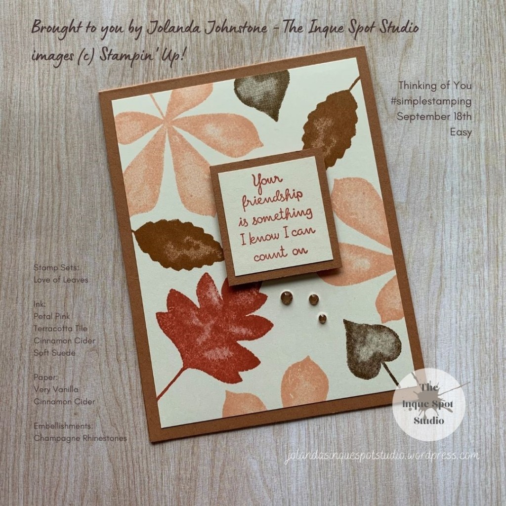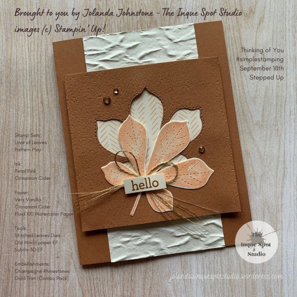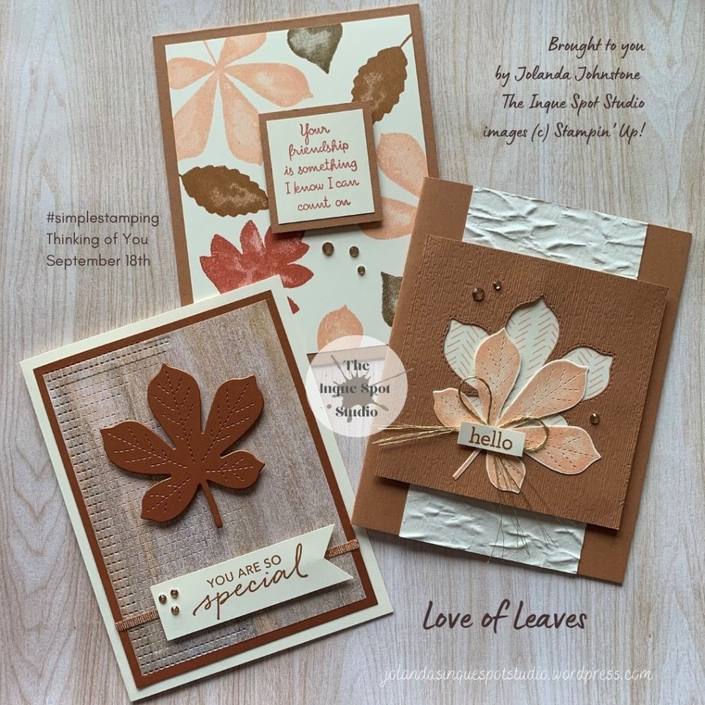 #simplestamping, #stampinup, #jolandajohnstone, #theinquespotstudio, #rubberstamps, #handmadecards, #makeacardsendacard, #sendacarddeliverasmile, #stepitup, #loveofleaves, #patternplay, #tastefultouches, #stitchedleavesdies, #thinkingofyoucards, #encouragementcards, #friendshipcards