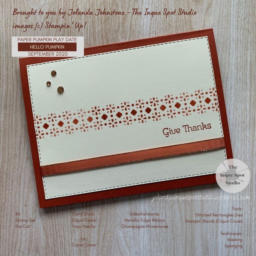 Today I created a couple of alternative cards with this month’s kit: HELLO PUMPKIN. This is a timely kit perfect for creating favors for Halloween and/or Thanksgiving. It is a little too early for me to make Halloween goodies for the my neighbors.