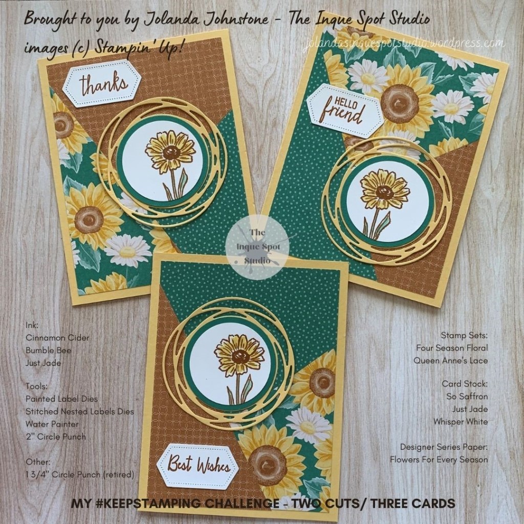 Continuing with my personal theme of Fall Florals, I chose to use the Flowers for Every Season Designer Series Paper. I picked the Sunflower pattern and matched it to the Cinnamon Cider and Just Jade coordinating patterns. For my card bases, I chose So Saffron. This is a great complimentary color to the more intense Bumble Bee color.