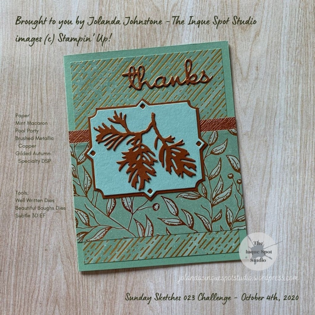 If I did not stamp a focal image, a stamped sentiment didn’t seem to look right either. Back to the dies. I chose the word “Thanks” from the Well Written Dies in the copper metallic cardstock to compliment the patterned paper.