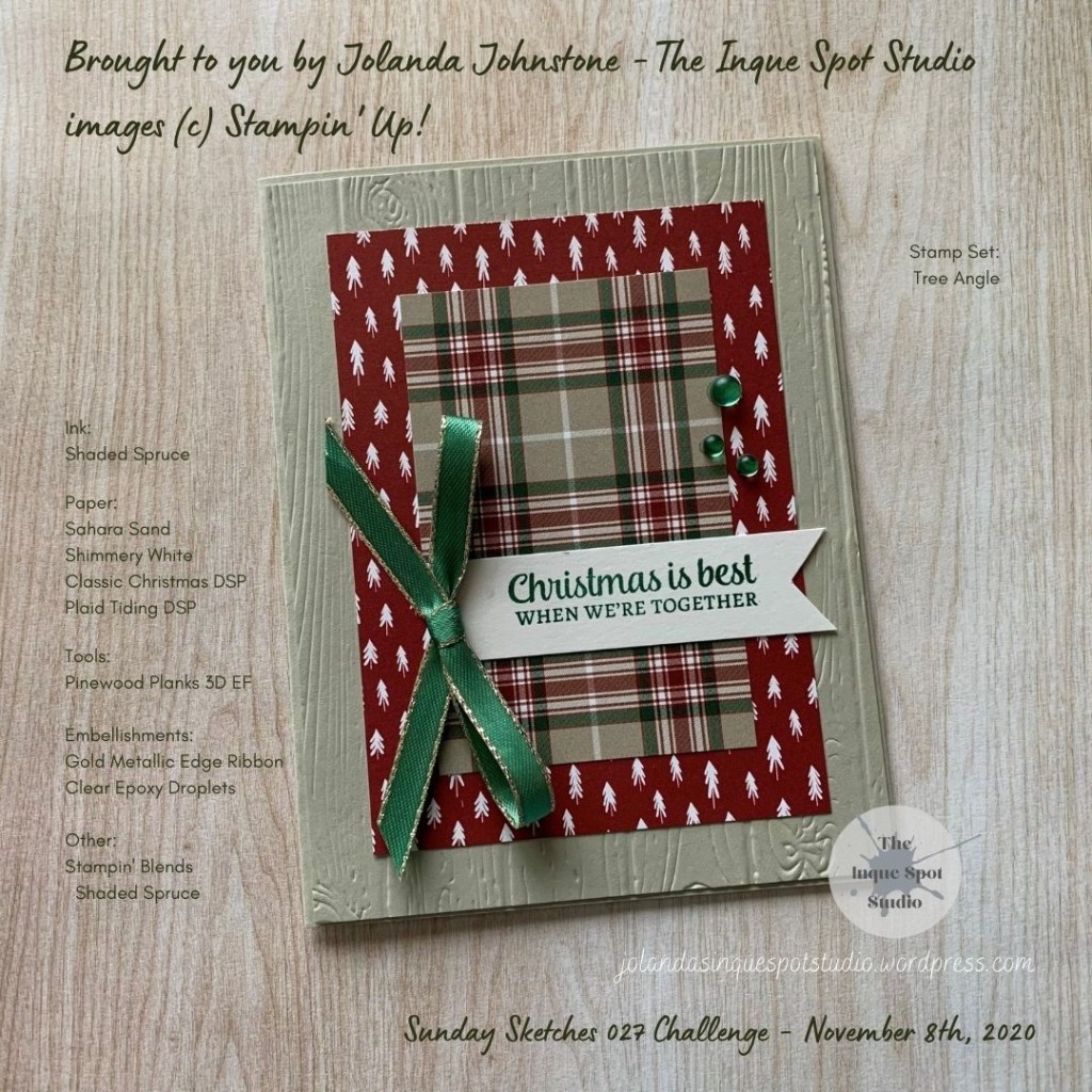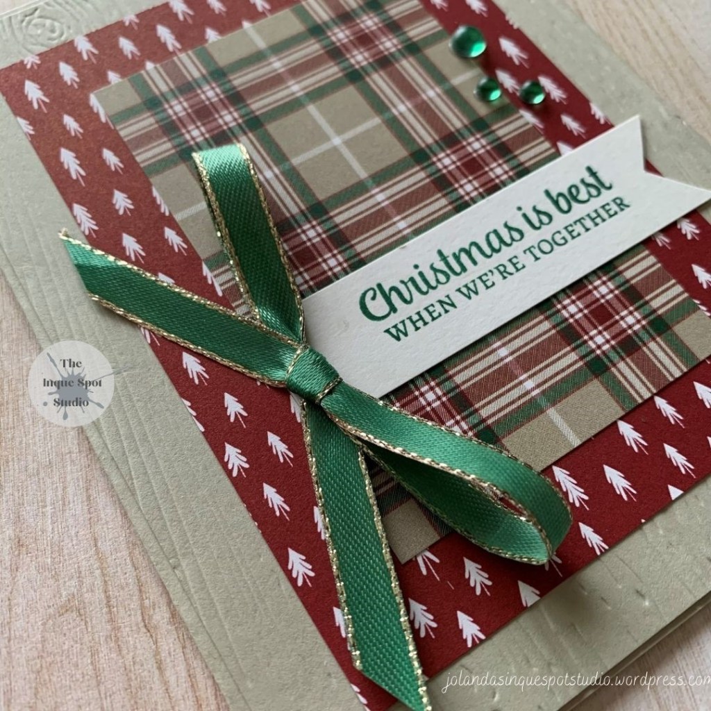 Again, DSP patterns are the prominent feature. I paired a sheet featuring Cherry Cobbler from Plaid Tidings with the Cherry Cobbler Rustic Tree pattern from limited time offering of Classic Christmas. The Sahara Sand mat is embossed with the Pinewood Planks embossing folder to carry on the rustic and homey vibe. The accent color, Shaded Spruce, ties in to plaid pattern. The sentiment from the Tree Angle stamp set is stamped on to a strip of Shimmery White card stock and cut to the flag shape. A length of Gold Metallic-Edged Ribbon has been colored green with the Shaded Spruce Stampin’ Blends as were the Clear Epoxy Droplets.