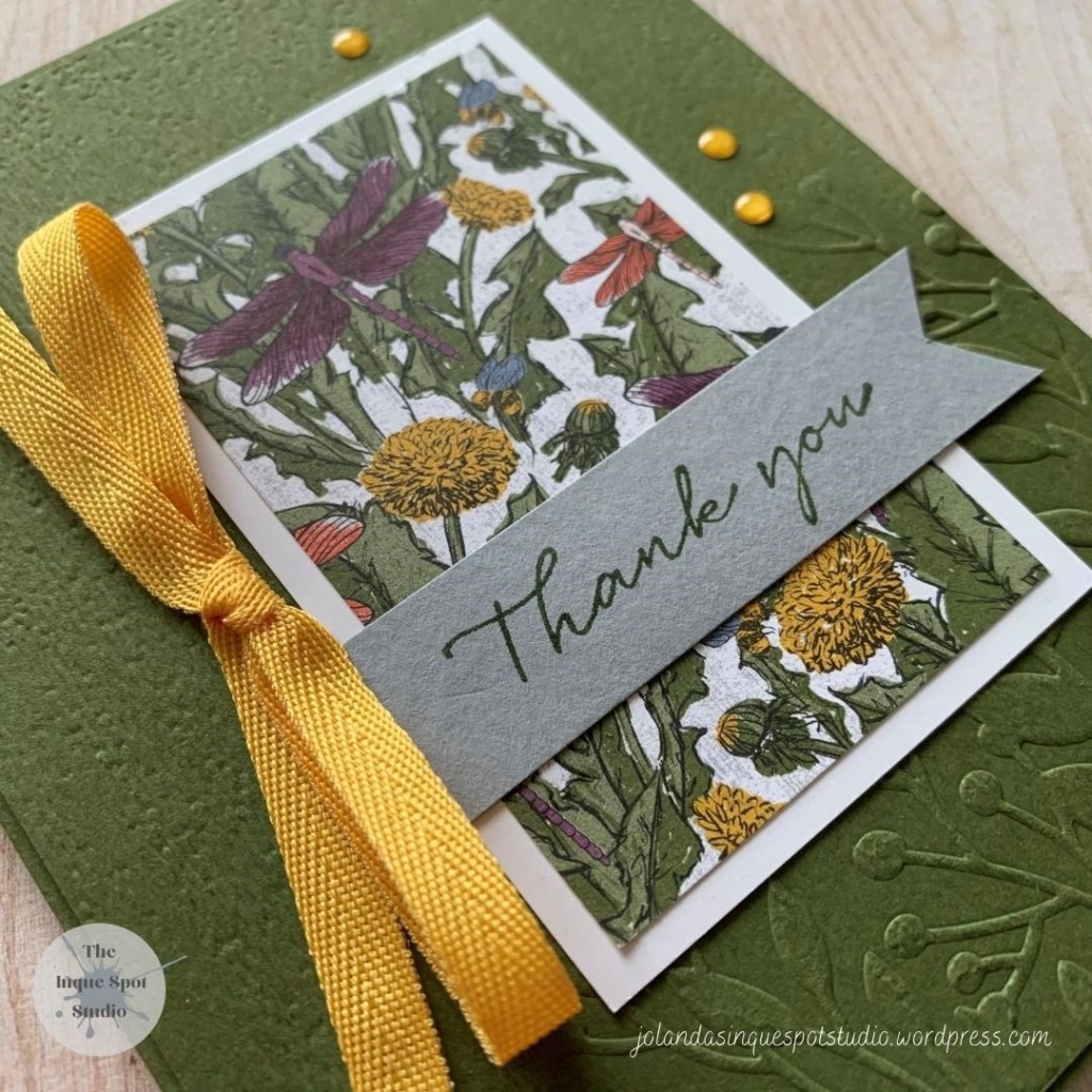 To add some texture and dimension, a Mossy Meadow mat was embossed with the Subtle 3D embossing folder and the lower right corner was additionally embossed with the Greenery embossing folder. I like how the Greenery ties in to the Dandelions in the Dandy Garden patterned paper. Using a Stampin’ Write Marker in Mossy Meadow, I inked only the Thank you part of the sentiment and stamped on a Smoky Slate strip cut to a flag shape. Color was added with a Bumble Bee In-Color Ribbon bow and a few Bumble Bee In-Color Enamel Dots.