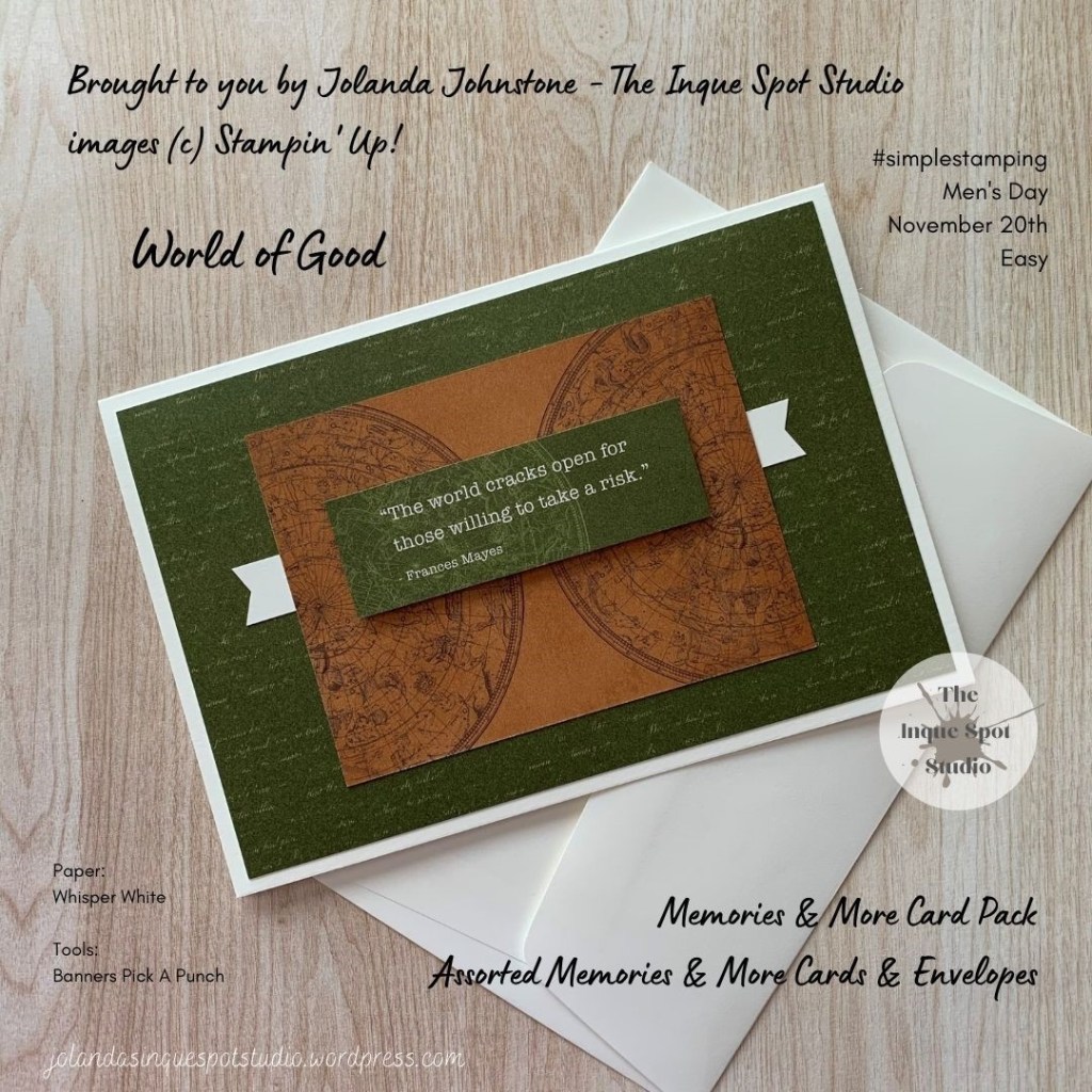 I am featuring the product: WORLD OF GOOD – MEMORIES & MORE CARD PACK. While the Memories & More Card Packs available from Stampin’ Up! can be used for Memory Keeping, I love to use them to create quick, easy and beautiful cards. Add-on the Assorted Memories & More Cards and Envelopes and you are good to go without even stamping or cutting anything! Yet it is a lot of fun to mix things up.