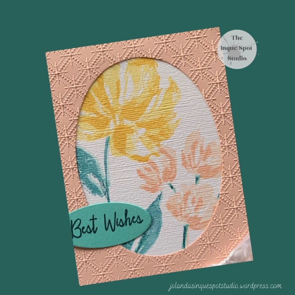 As I played around with the layout, I picked Pool Party for the card base and Pretty Peacock for the mat. I wanted to add a layer of some sort in Petal Pink. After several back and forth ideas, an Oval frame felt like the right choice and I chose to emboss it with the Dainty Diamonds 3D embossing folder. I stamped the Best Wishes sentiment from Queen Anne’s Lace in Pretty Peacock on Coastal Cabana and echoed the oval shape.
