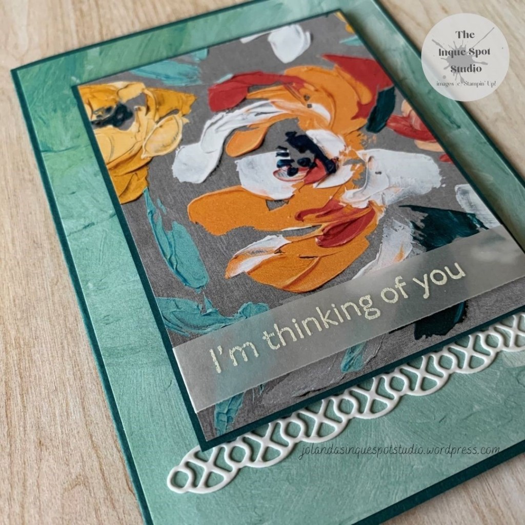 Similarly, I used all the elements from the sample (#282). Fine Art Floral Designer Series Paper is used for both the back panel and the focal image panel. I stepped up the simple layout by adding accent edges in Pretty Peacock to separate the Floral Image from the Painted Canvas panel.