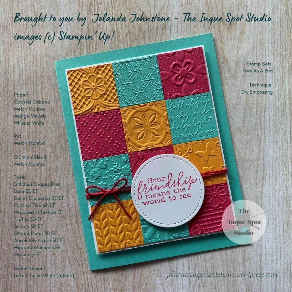 Here is what I created…using a variety of Stampin’ Up!’s wonderful Embossing Folders and the sentiment from a stamp set that hasn’t seen any ink for a while: Free As A Bird.