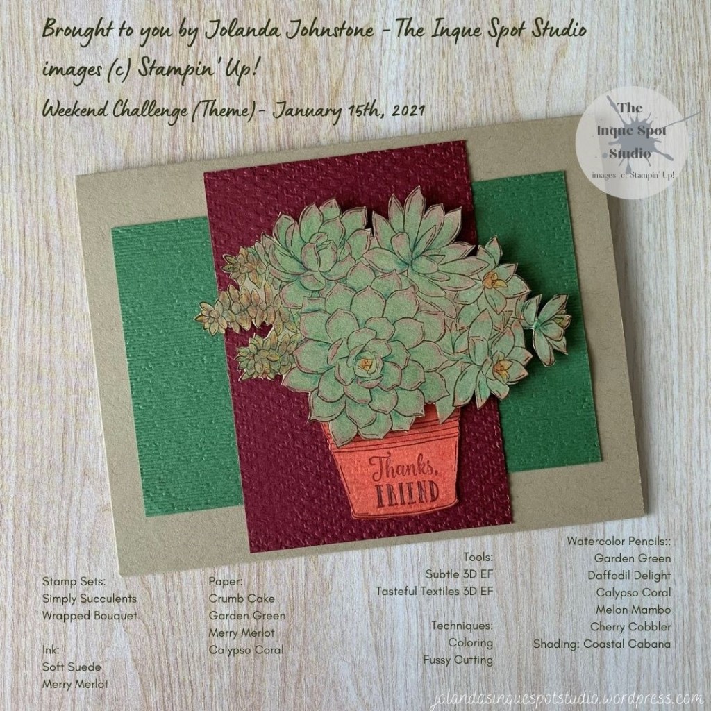 I thought the succulents would look nicer fussy cut and popped up against the Merry Merlot panel and so that is what I did. I added the sentiment, Thanks, Friend, from the Wrapped Bouquet stamp set to the plant pot which was stamped on to Calypso Coral with Merry Merlot ink and shaded with the Cherry Cobbler Watercolor Pencil before fussy cutting. I did add a little texture by dry embossing the pot with the Subtle 3D Embossing Folder.