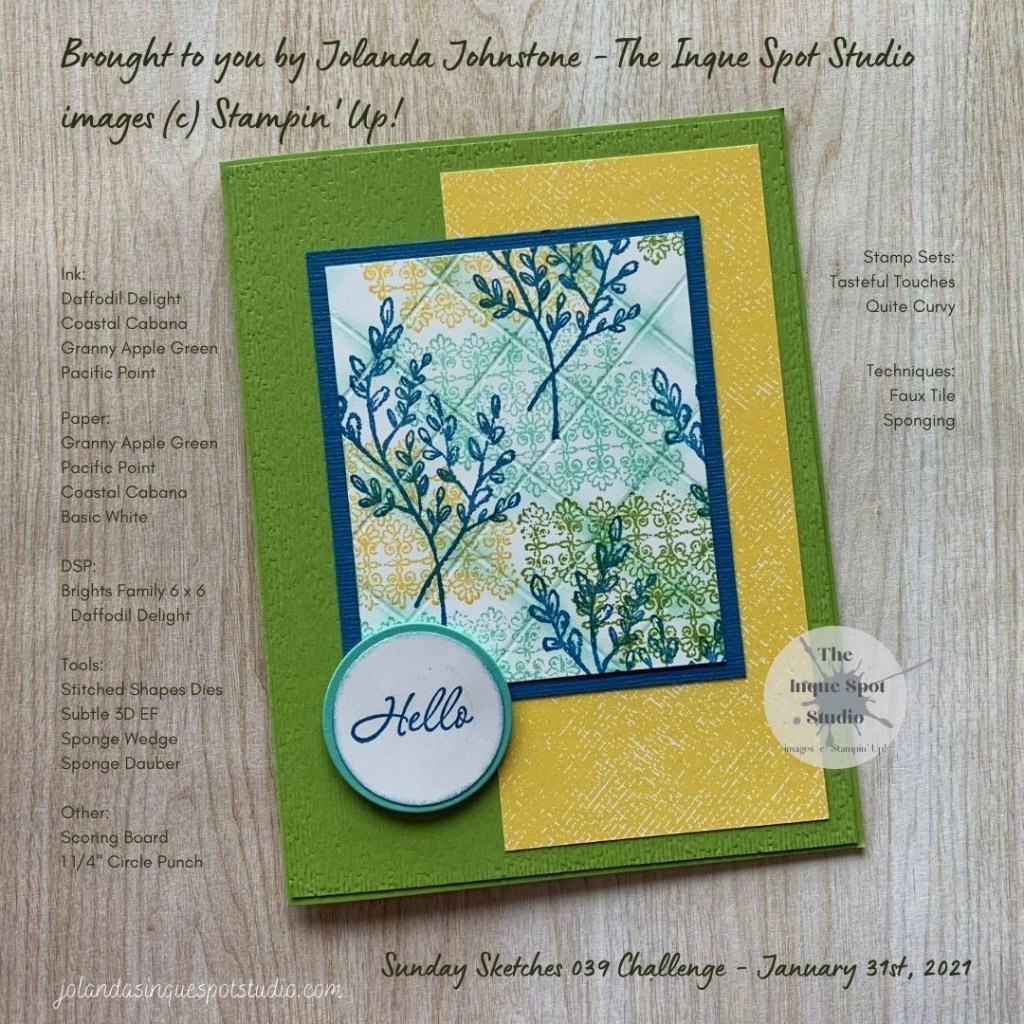 A quick, bright card to illustrate the Faux Tile Technique using the Tasteful Touches stamp set and the colors, Daffodil Delight, Coastal Cabana, Granny Apple Green and Pacific Point.
