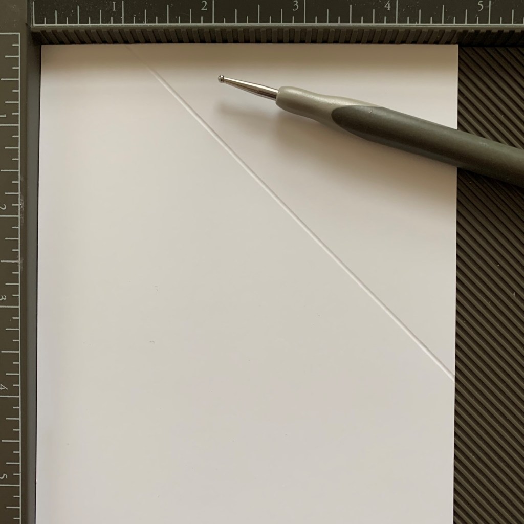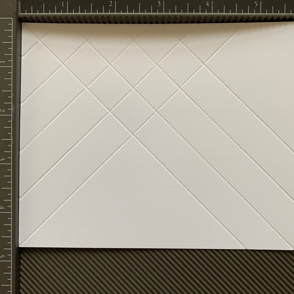 Step 1: Score your cardstock (Basic White) at regular intervals, square or diagonal. I used a 1” measure.