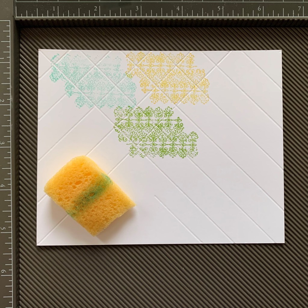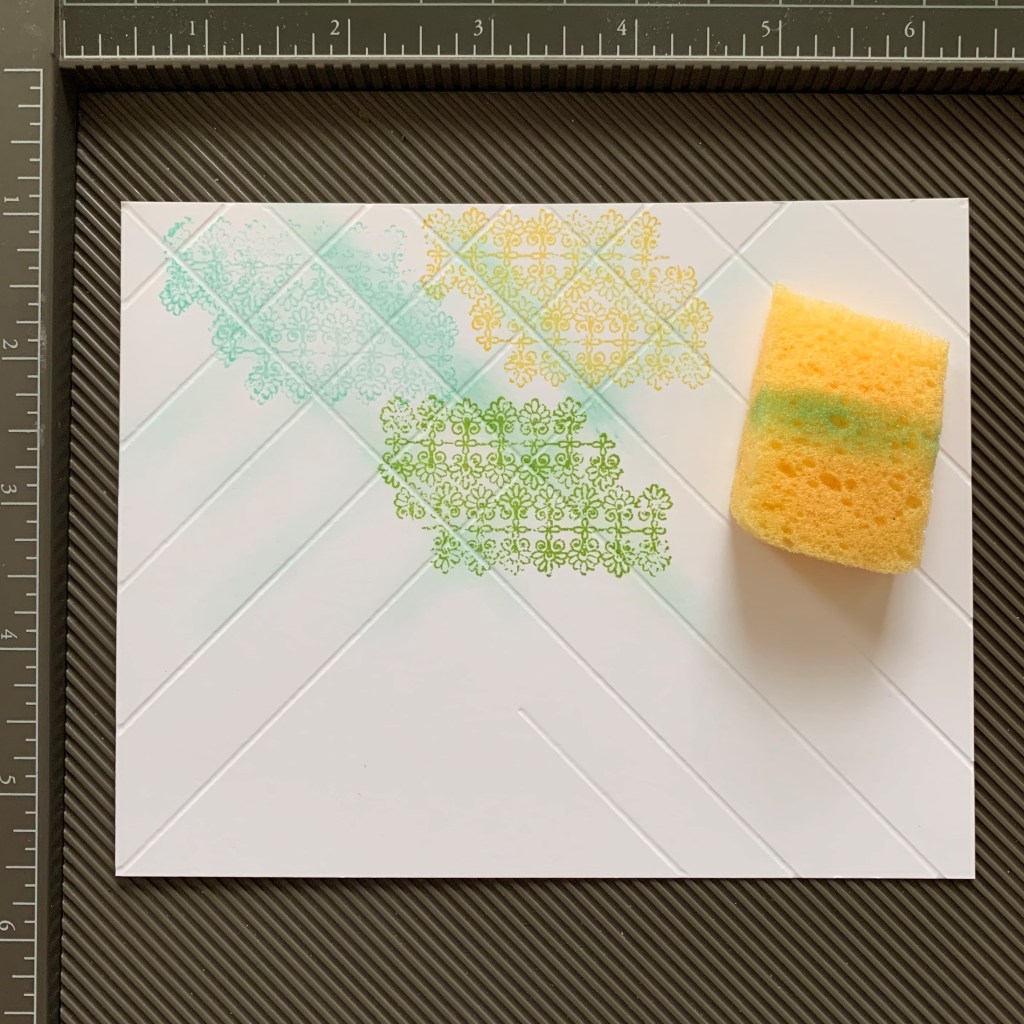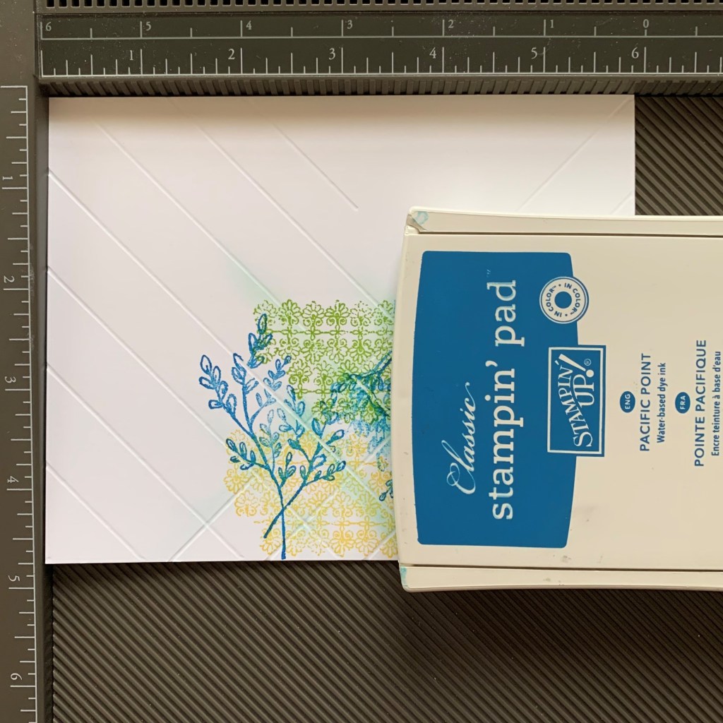 Step 3. Choose your “Tile” Background stamp. I chose the Filigree Flower one from Tasteful Touches and repeated the pattern in the colors, Daffodil Delight, Coastal Cabana and Granny Apple Green. You will notice that the indented score lines do not pick up any ink. This gives the impression of tiles.