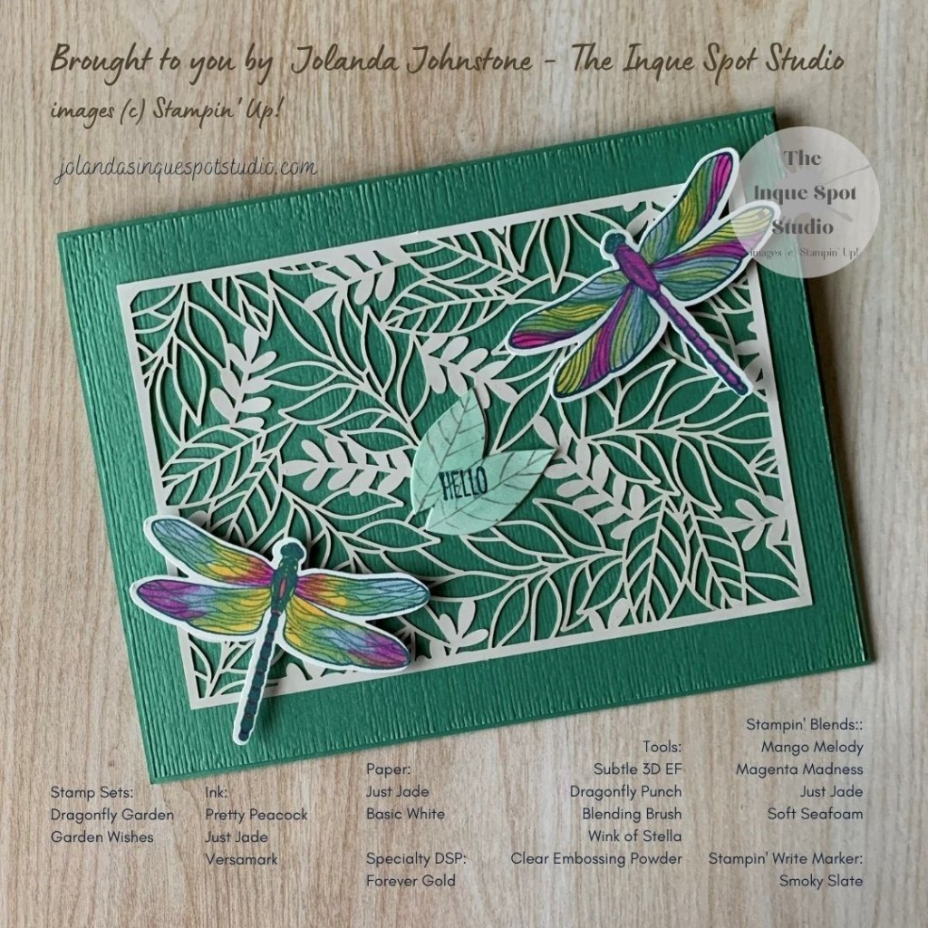 I liked how the Just Jade color made the white leaves pop. Iridescent Dragonflies came to mind for the corner elements. I stamped the Dragonflies from the Dragonfly Garden stamp set in Pretty Peacock and colored them with various bright Stampin’ Blends. A generous application of Wink of Stella makes them sparkle so prettily.