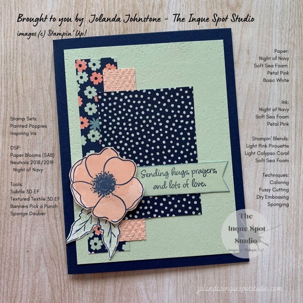 For the focal image (circle), I created the Flower and Leaves with stamps from the Painted Poppies stamp set. Petal Pink, Night of Navy and Soft Sea Foam inks on to a scrap of Basic White cardstock. I could have used the companion Poppy Moments Dies, but I wanted a close cut and it was very quick for me to fussy cut.