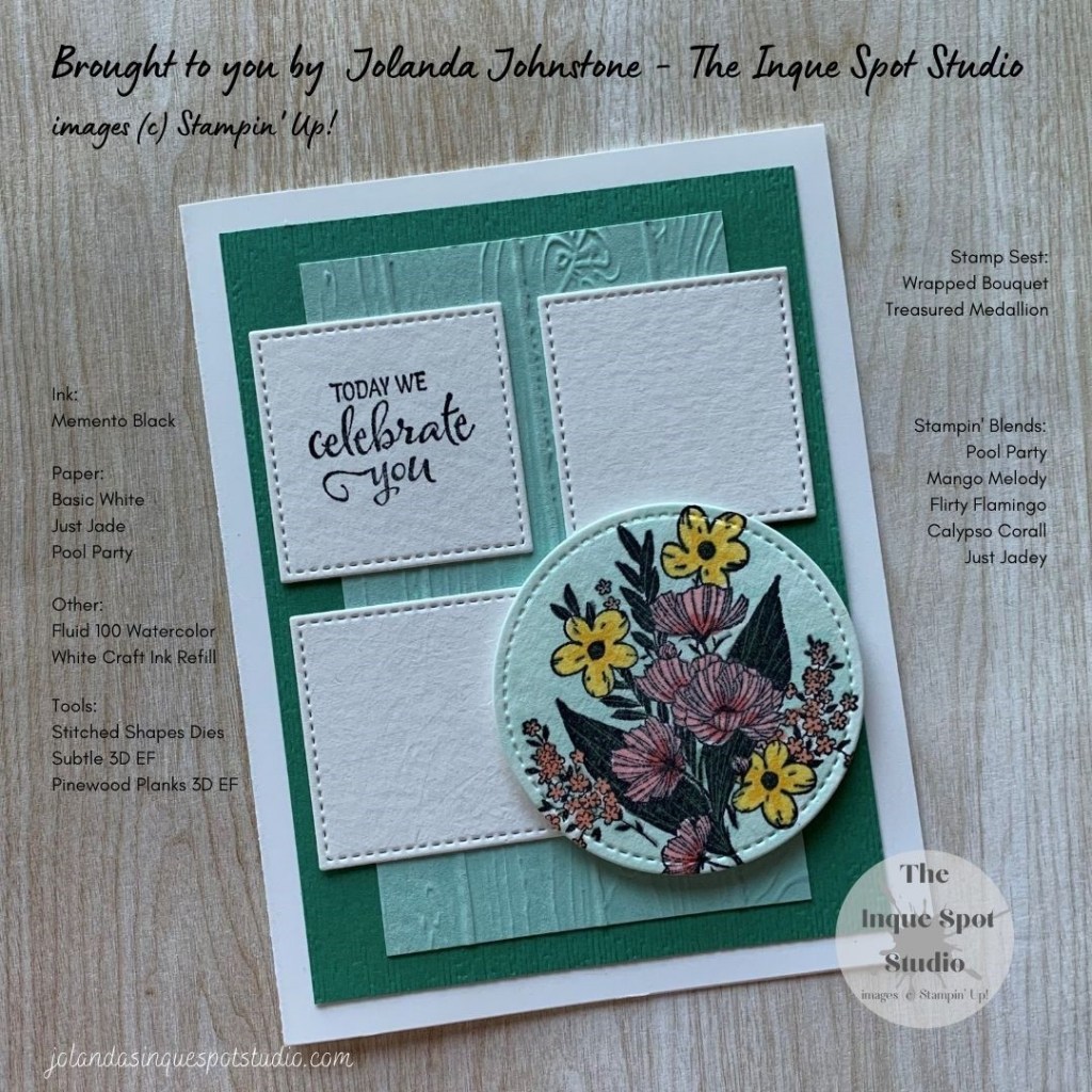 - The three squares (1⅝”) were die-cut with the Stitched Shapes Die Square from Watercolor Paper. The sentiment, Today We Celebrate You, comes from the Treasured Medallions stamp set and is also stamped in Memento Tuxedo Black Ink.