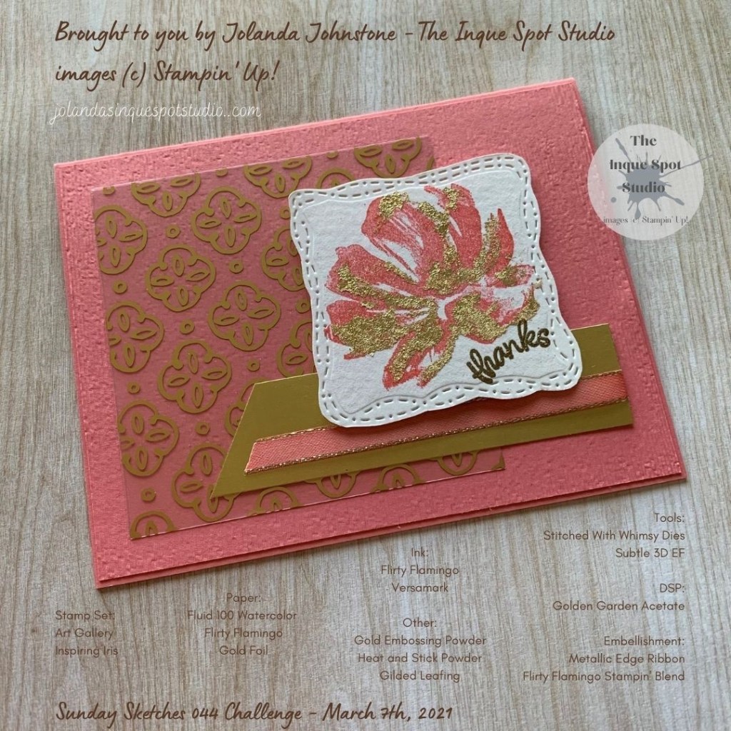 I chose to stamp the larger floral image from the Art Gallery stamp set onto a piece of Fluid 100 Watercolor Paper with Flirty Flamingo ink. I chose this paper for its thickness and for not being exactly white or vanilla in color tone. The two-step matching floral image was inked in Versamark and stamped over the original image. Heat and Stick Powder was added and heated to melt. The piece was then added to a Gilded Leafing Embellishment “bath” to add the golden highlights.