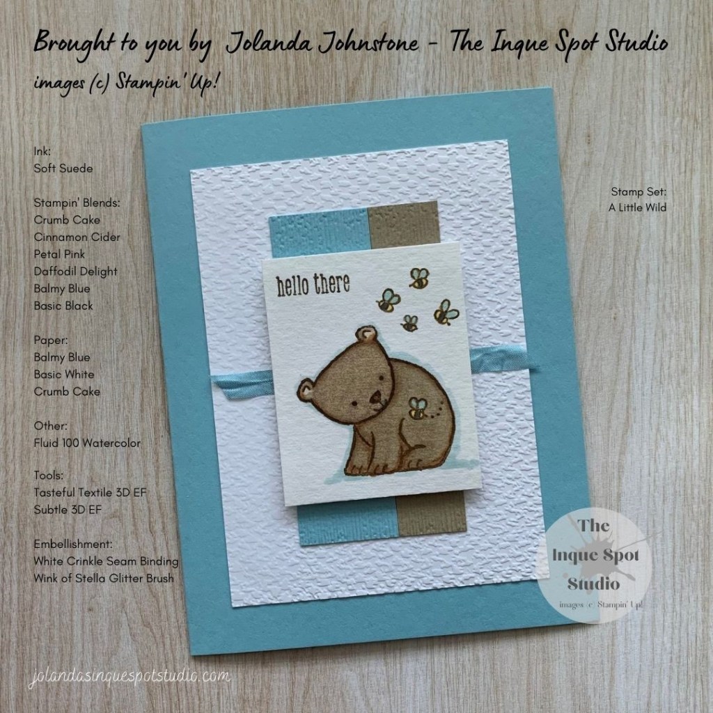 - Focal Image: (2” x 2½”) The Baby Bear, Bees and Sentiment, from the retired stamp set, A Little Wild was stamped in Soft Suede ink on to a small piece of Fluid 100 Watercolor Paper. The Bear and Bees were colored with a variety of Stampin’ Blends. (Crumb Cake, Cinnamon Cider, Petal Pink, Daffodil Delight, Balmy Blue and Basic Black). Wink of Stella Glitter was added to the wings of the Bees.