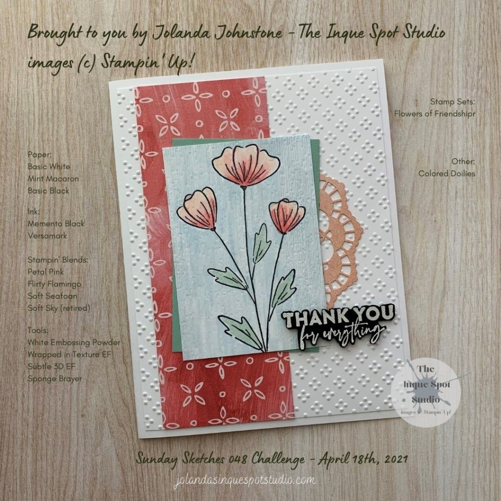Time for this week’s Sunday Sketch – SS049. A sneak peek of one of the new stamp sets that will debut in May. Flowers of Friendship is a sweet little set with a bunch of Thank You sentiments and comes bundled with a coordinating Flowers and Leaves punch. Over at The Flower Challenge #55, the theme colors were pastel so that is what I chose to work with.