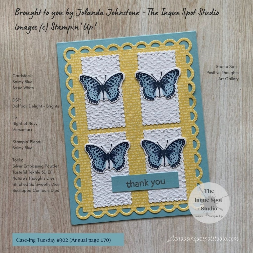 Sketch – Case-ing Tuesday (#302); Colors – Just Add Ink (JAI552); Styling – TIC TAC TOE (TTTC111).  The Tic Tac Toe line includes Embossing, Layers and Scallops.  The Case-ing Tuesday Sketch included lots of Layers, and I went for Scallop edging on a couple of those layers. To add interest, I embossed the four rectangles for the third element.  From the Just Add Ink Inspiration photo I selected the colors: Yellow, Blue, White and Silver.