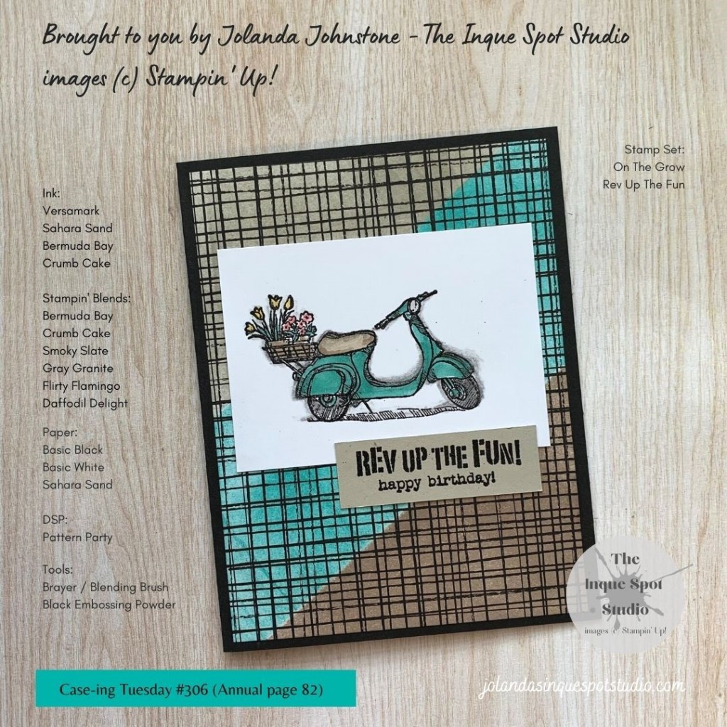 - Focal Image: The Vespa image from the retired On The Grow stamp set (my favorite) was stamped in Versamark ink and heat-set with Black Embossing Powder. The image was then colored with a variety of Stampin’ Blends: Bermuda Bay, Crumb Cake, Smoky Slate, Gray Granite, Flirty Flamingo and Daffodil Delight.