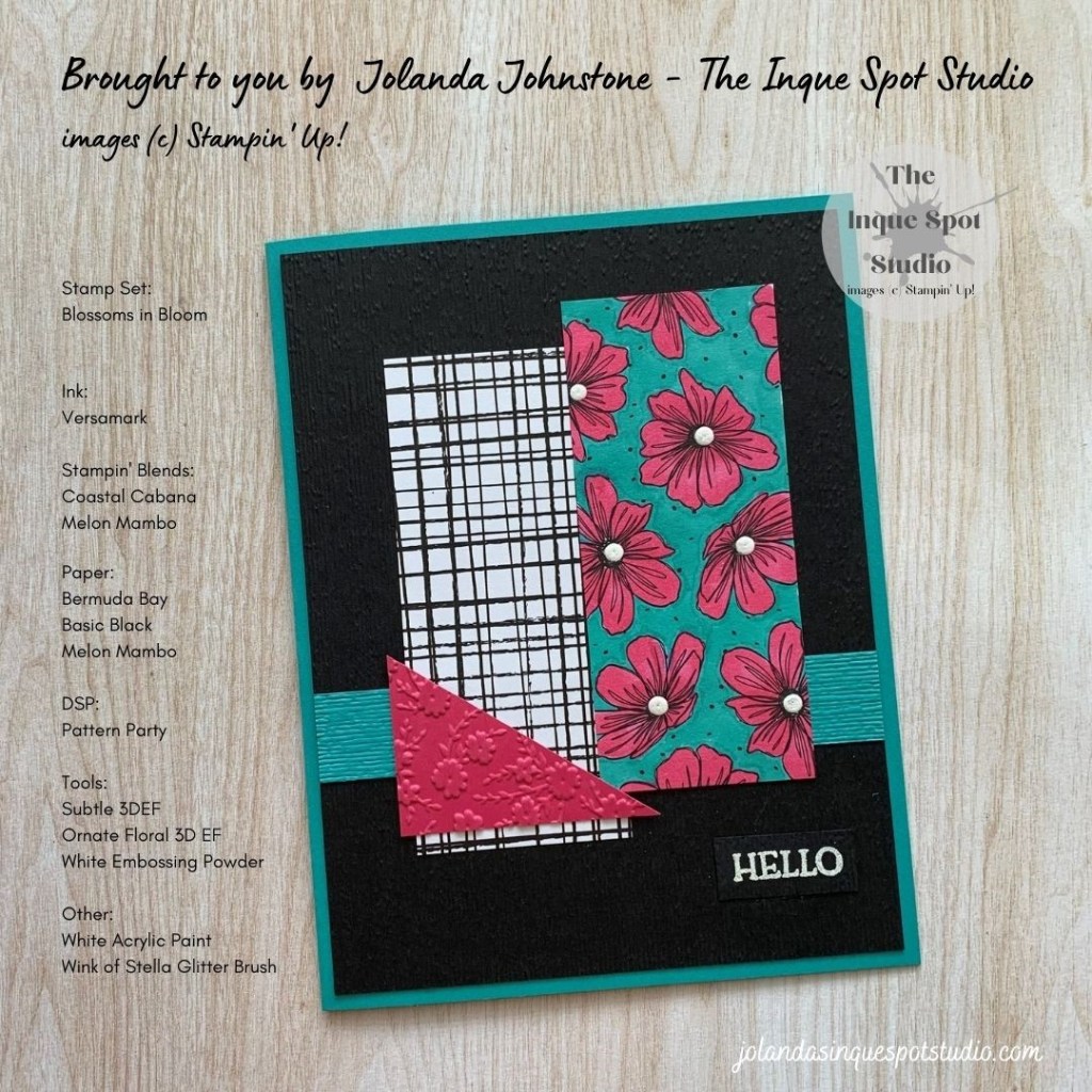 - The Sentiment Label: (1” x ⅜”) Basic Black cardstock. The sentiment, Hello, from the Blossoms in Bloom stamp set was stamped in Versamark and heat-set with White Embossing Powder. The label was also dry-embossed with the Subtle 3D Embossing Folder to blend in to the background panel.