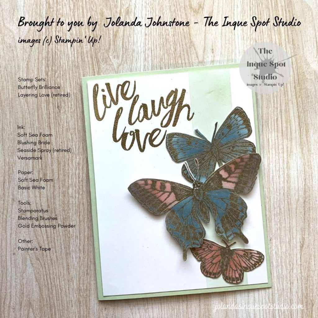 The trio of Butterflies were gathered together and added in a cluster on the right side of the background panel and then adhered to a Soft Sea Foam card base (8½” x 5½” scored at 4¼”).
