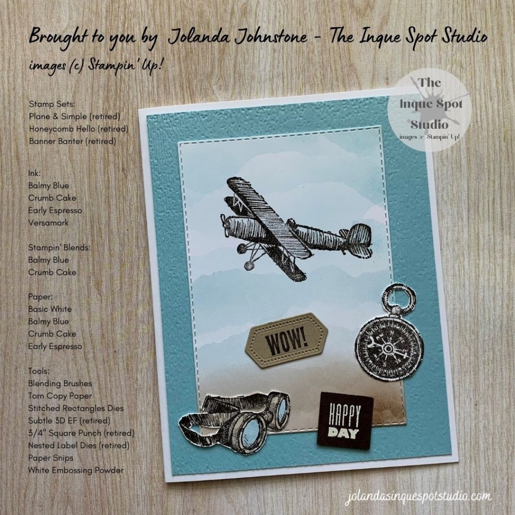The color challenge over at The Color Hue (#19) this week is Blue and Brown. Lots of possibilities but blue made me think of sky and what goes in to the sky? Balloons, Birds, Tall Trees…and Airplanes! The Plane & Simple stamp set needed some ink time and stamped in brown would work just fine.