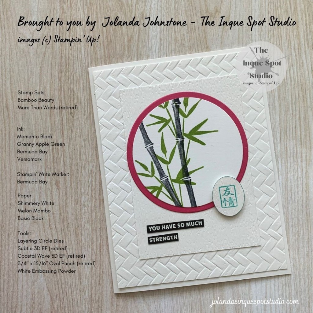 - Shape / Circle: (2⅝”) Shimmery White cardstock die-cut with one of the Layering Circle Dies. The Bamboo Trees were created by stamping the Stalks with Memento Tuxedo Black ink and the Leaves with Granny Apple Green ink.