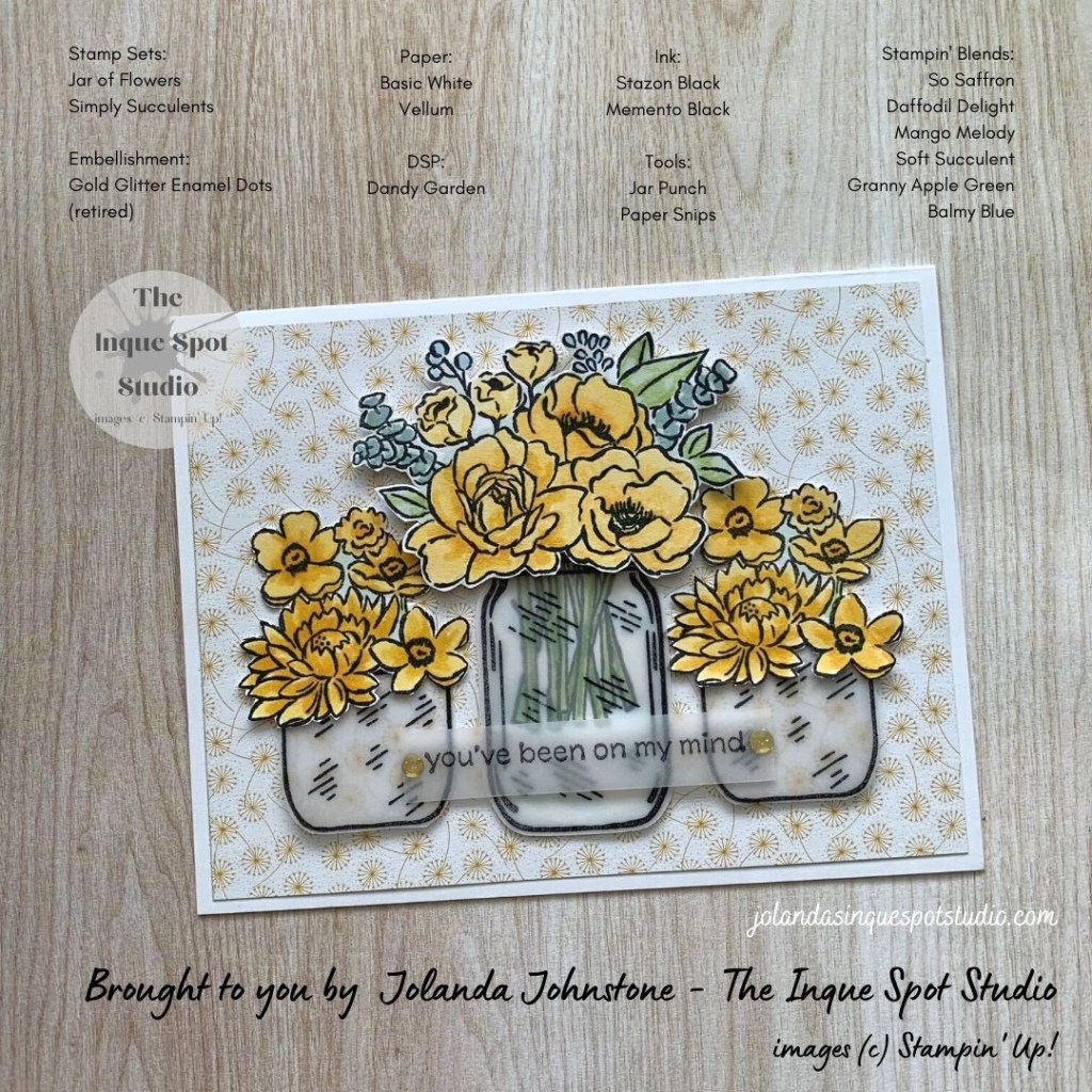 All of the elements were arranged to match the sketch on a Basic White card base: (8½” x 5½” scored at 4¼”). The side Bouquet Jars were kept level. The “tilt” did not quite look right or suit the overall arrangement. The Glue Dots I used to add the Sentiment Label are hidden behind the Gold Glitter Enamel Dots. The little touch of yellow gold finishes the card of nicely.