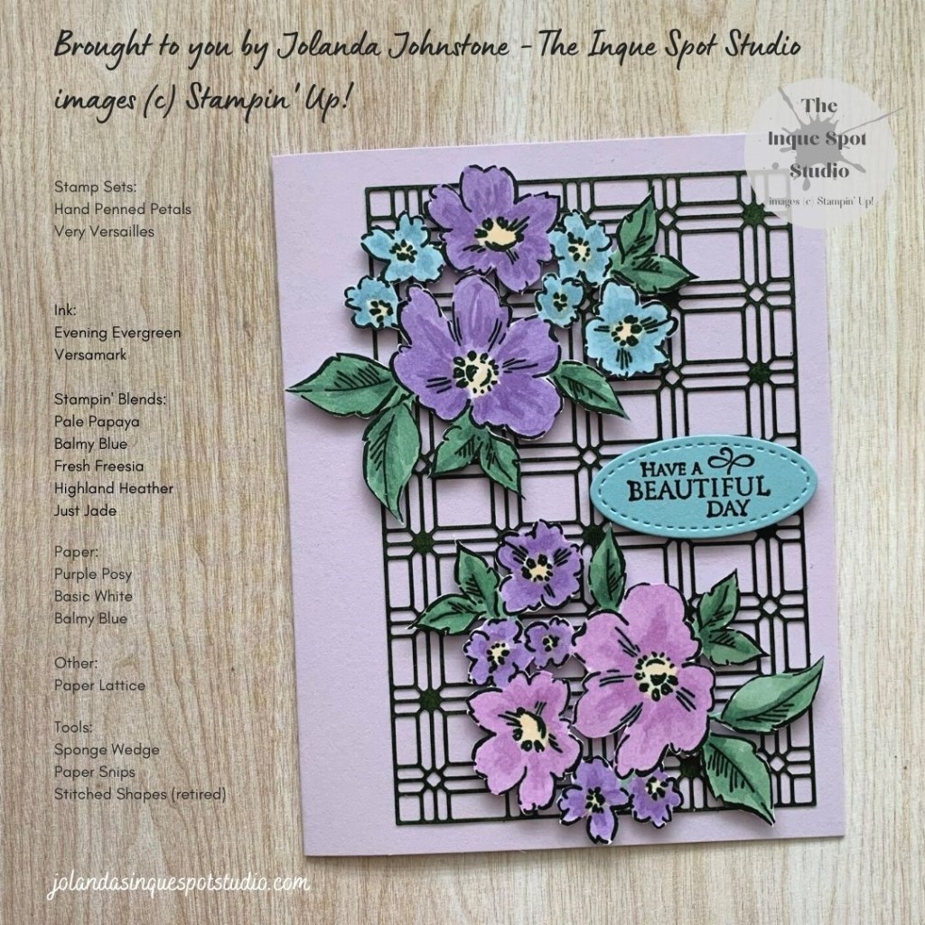 The colored florals and lattice looked prettiest on a Purple Posy (retired color) card base (8½” x 5½” scored at 4¼”). The Fresh Freesia and Highland Heather colors are just a bit darker and pop nicely against it.