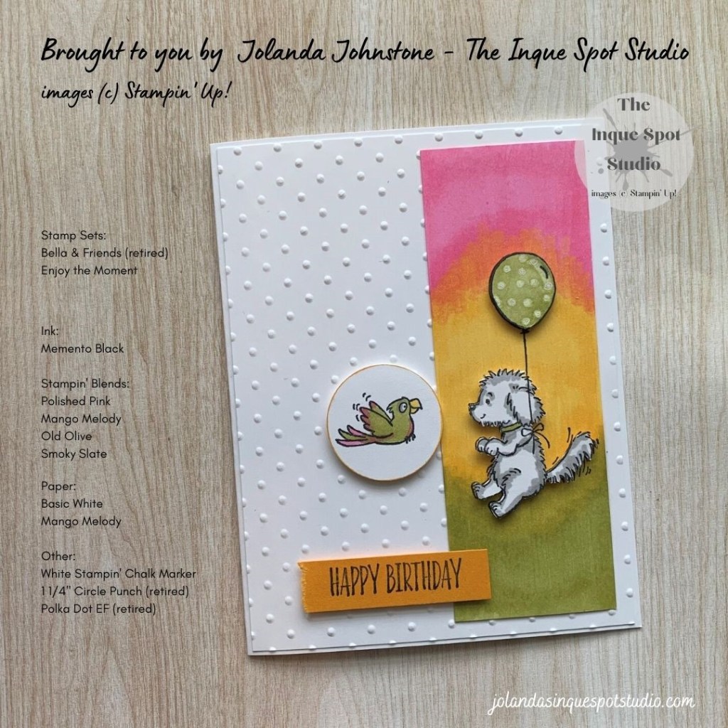 • Bella, Balloon and Parrot were stamped onto a scrap of Basic White cardstock with Memento Tuxedo Black ink.  All the images were colored with Stampin’ Blends: Bella – Smoky Slate, Balloon – Old Olive and Parrot – Old Olive, Polished Pink and Mango Melody.