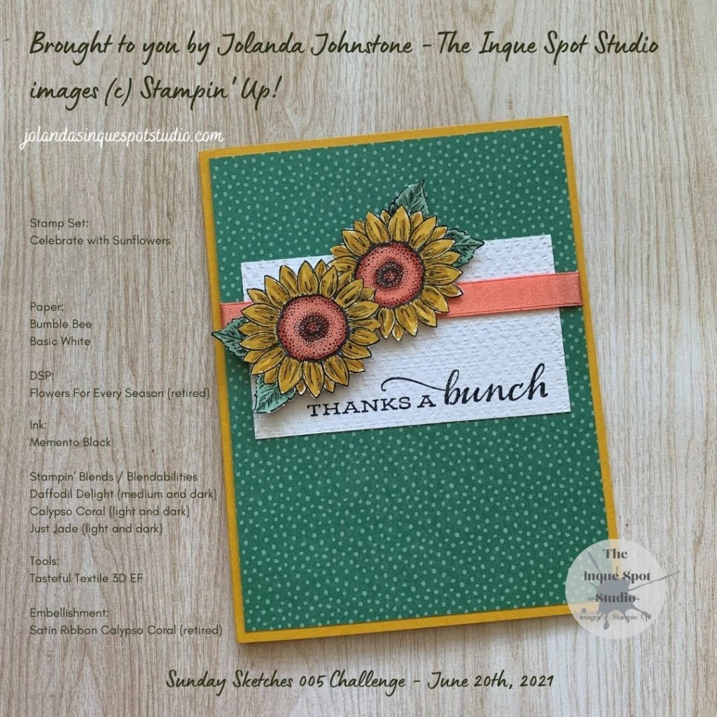 - Focal Image: Sunflowers. The smaller Sunflower image was stamped twice on to a scrap of Basic White cardstock using Memento Tuxedo Black ink. The Sunflowers were colored with the challenge colors. Daffodil Delight medium and dark Stampin’ Blendabilities stepped in for Bumble Bee (Flower Petals) and Calypso Coral (Flower Centers) and Just Jade (Leaves) Stampin’ Blends were used to complete the image. I did use the coordinating die from the Sunflower Dies set but ultimately chose to fussy cut the image to eliminate the white border with my Paper Snips.