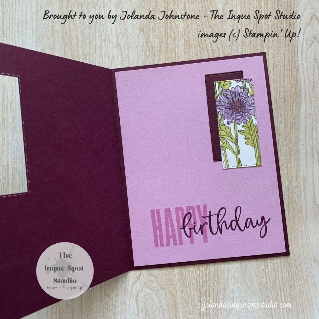 - Inside Card Background Panel: (4” x 5¼”) Fresh Freesia cardstock. The sentiment words, HAPPY and birthday, from the Biggest Wish stamp set were similarly stamped with Fresh Freesia and Blackberry Bliss ink. The resultant Blackberry Bliss die-cut rectangle was off-set against the small Daisy rectangle when it was positioned in the window opening completing the card.
