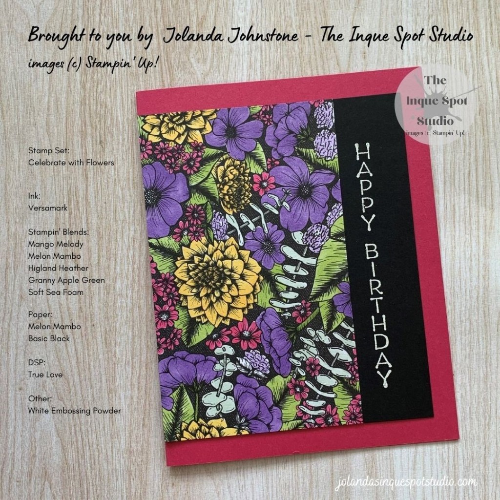 - Background Panel: (3⅞” x 4¾”) Basic Black cardstock. The vertical sentiment, Happy Birthday, from the Celebrate with Flowers stamp set was stamped in Versamark ink and heat-set with White Embossing Powder.