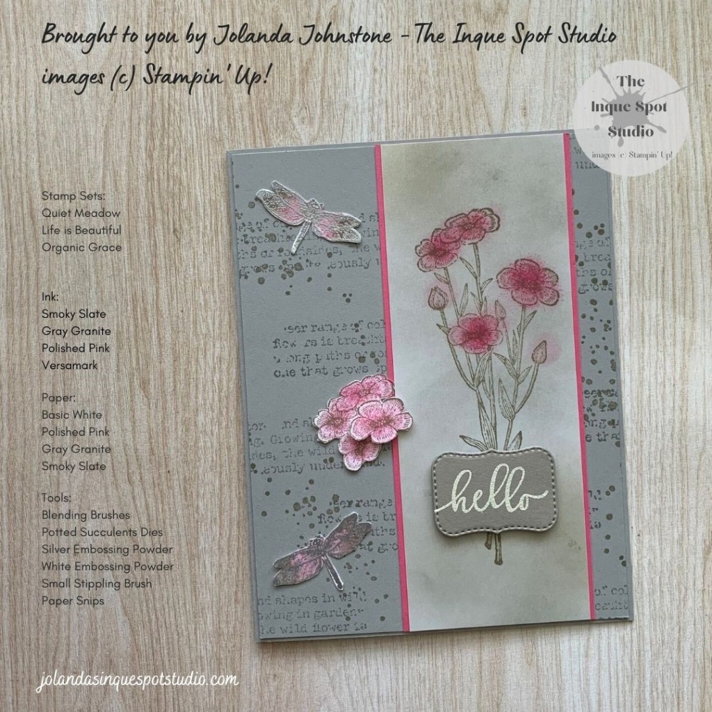 - Shapes (1) and (3): Mini Dragonfly. The small Dragonfly from a retired but complimentary stamp set – Organic Grace was stamped in Versamark ink and heat-set with Silver Embossing Powder on a scrap of Basic White cardstock. The Dragonflies were colored with Polished Pink and Smoky Slate ink using the Stipple Brush and then Fussy Cut with Paper Snips.