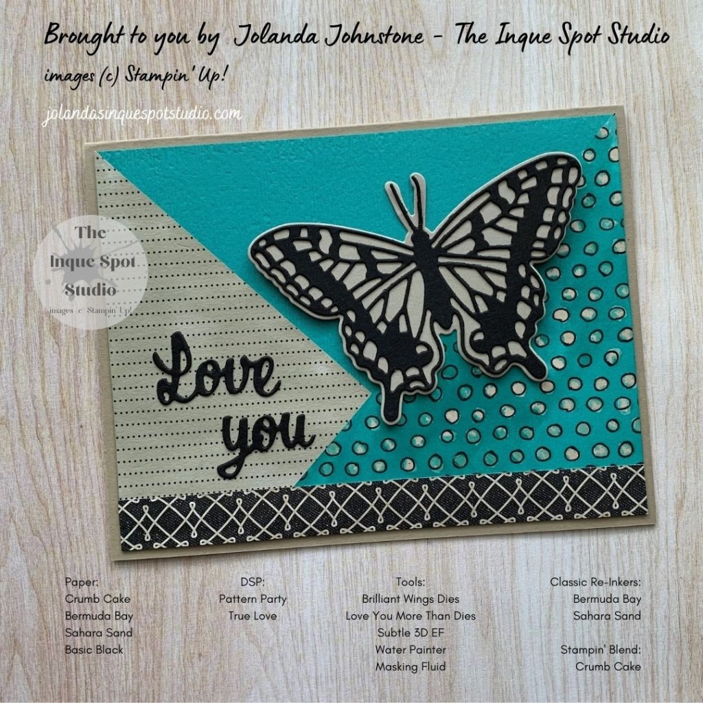 - Focal Image: Butterfly Detail (Basic Black cardstock) and Background (Sahara Sand cardstock) were die-cut with the matching dies from the Brilliant Wings Dies set.