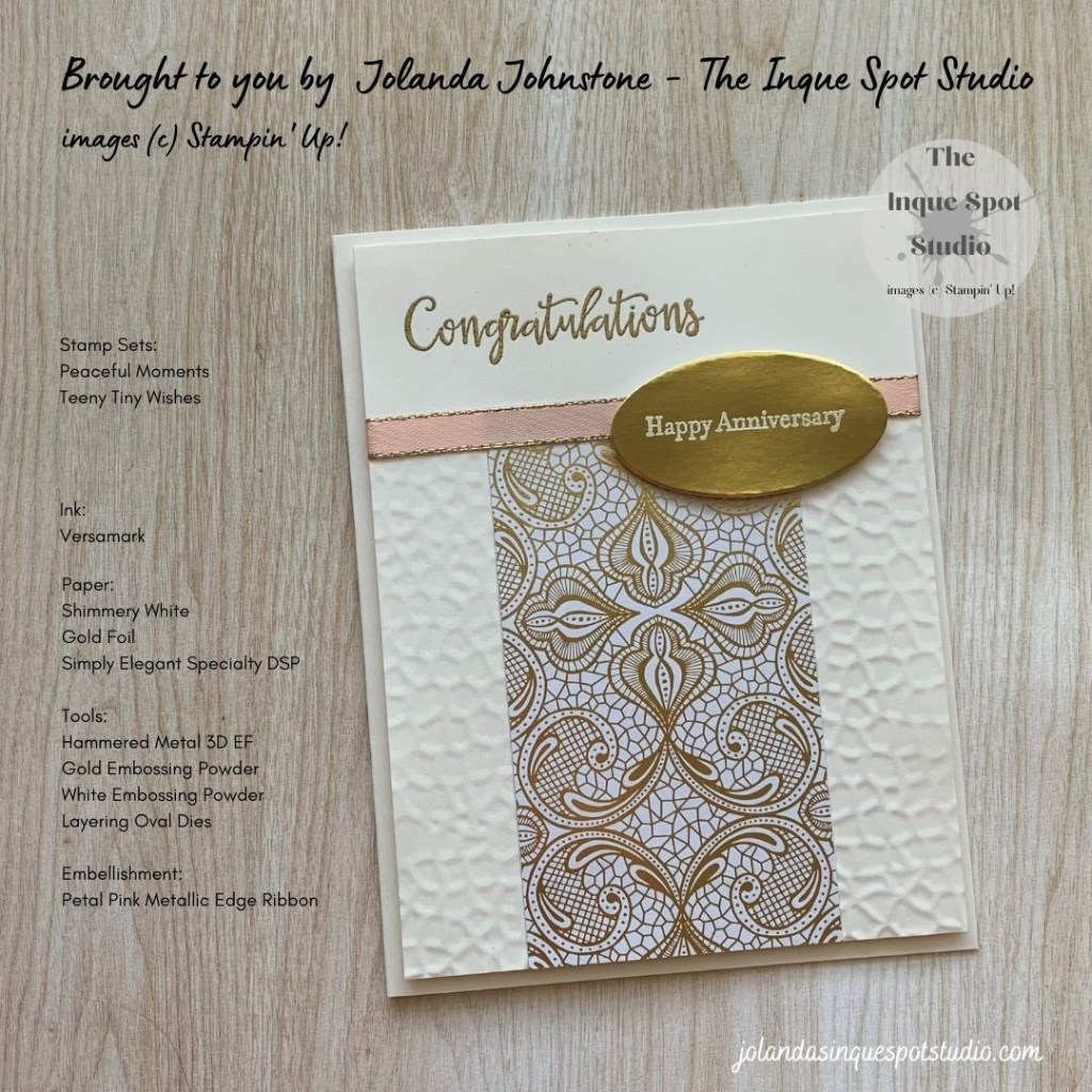 - Sentiment Label: (2” x 1”) Gold Foil cardstock. The sentiment, Happy Anniversary, from the Teeny Tiny Wishes stamp set was stamped in Versamark ink and heat-set with White Embossing Powder then die-cut with one of the Layering Oval Dies.