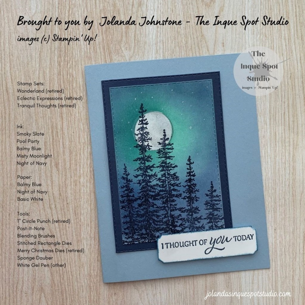 - Focal Scene: (4¼” x 5½”) Basic White cardstock. Moon: (1”) From the retired Eclectic Expressions stamp set stamped with Smoky Slate ink. Mask: (1”) Post-It-Note created with the retired (1”) Circle Punch. Sky: Using a Blending Brush, the first color applied over and around the Moon Mask was Pool Party ink followed by Balmy Blue ink. The next color applied was Misty Moonlight ink and finally Night of Navy ink. Pine Trees: The Mask was removed and the Pine Trees from the retired Wonderland stamp set were stamped with Night of Navy ink. I chose these trees (from the many that I have) because I liked the height and skinniness of the trees. The Scene was then trimmed to (2⅝” x 4”) by die-cutting the image with that sized die from the Stitched Rectangle Dies set. Stars: Added with a White Gel Pen.