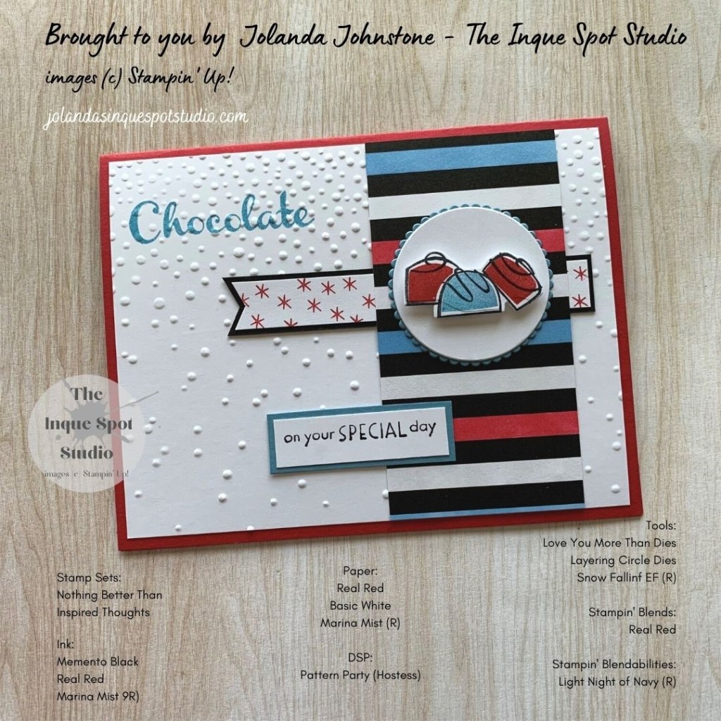 • Background Panel: (4” x 5¼”) Basic White cardstock.  The word “Chocolate”, also from the Nothing Better Than stamp set, was stamped with Marina Mist ink in the upper left corner.  The panel was then dry-embossed with the retired Snow Falling Embossing Folder.  This was to suggest powdered confectionary sugar.