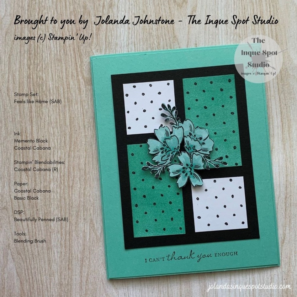 - Background Panel: (4⅛” x 5⅜”) Coastal Cabana cardstock. The sentiment, I can’t thank you enough, from the free Sale-a-bration (SAB) choice Feels Like Home stamp set was stamped at the bottom with Memento Tuxedo Black ink.