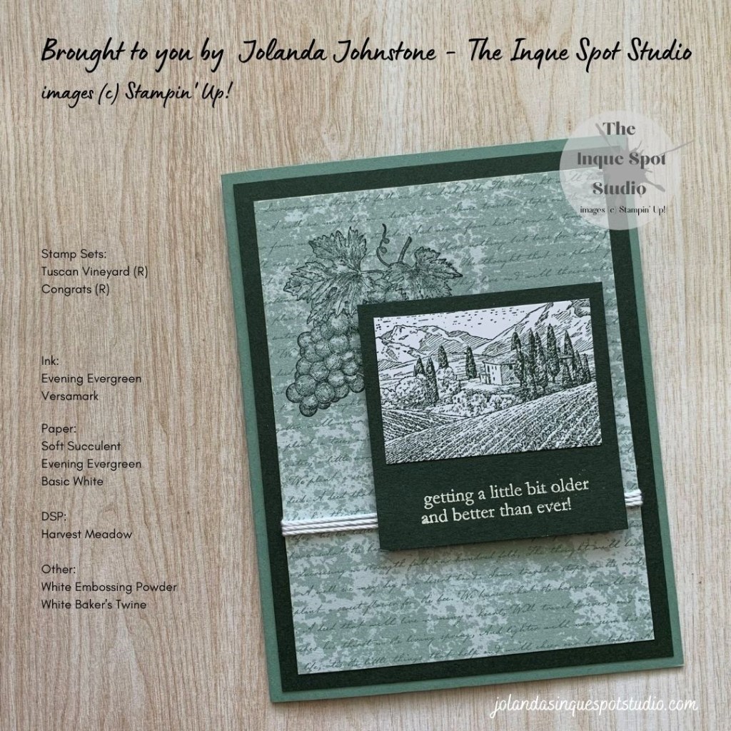 - Focal Scene: (2¼” x 1½”) Basic White cardstock. The Vineyard Scene from the retired Tuscan Vineyard stamp set (circa 2016) was stamped with Evening Evergreen ink and then trimmed to size.