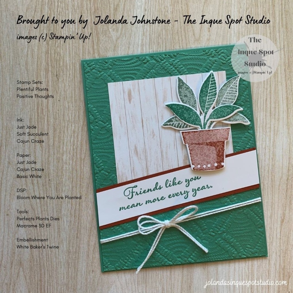 To finish off the card, I chose a Just Jade card base (11” x 4¼” scored at 5½”).  The Plant and Pot were popped up with Dimensionals.